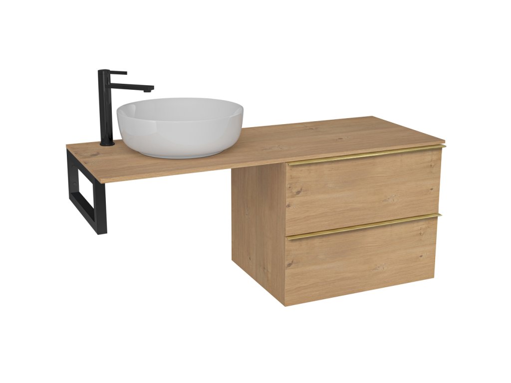 CERANO - Doska pod umývadlo Navira Slim - 141x46,5x1,8 cm - skrinka Velora 69 cm - dub medový, zlatá úchytka - konzola čierna
