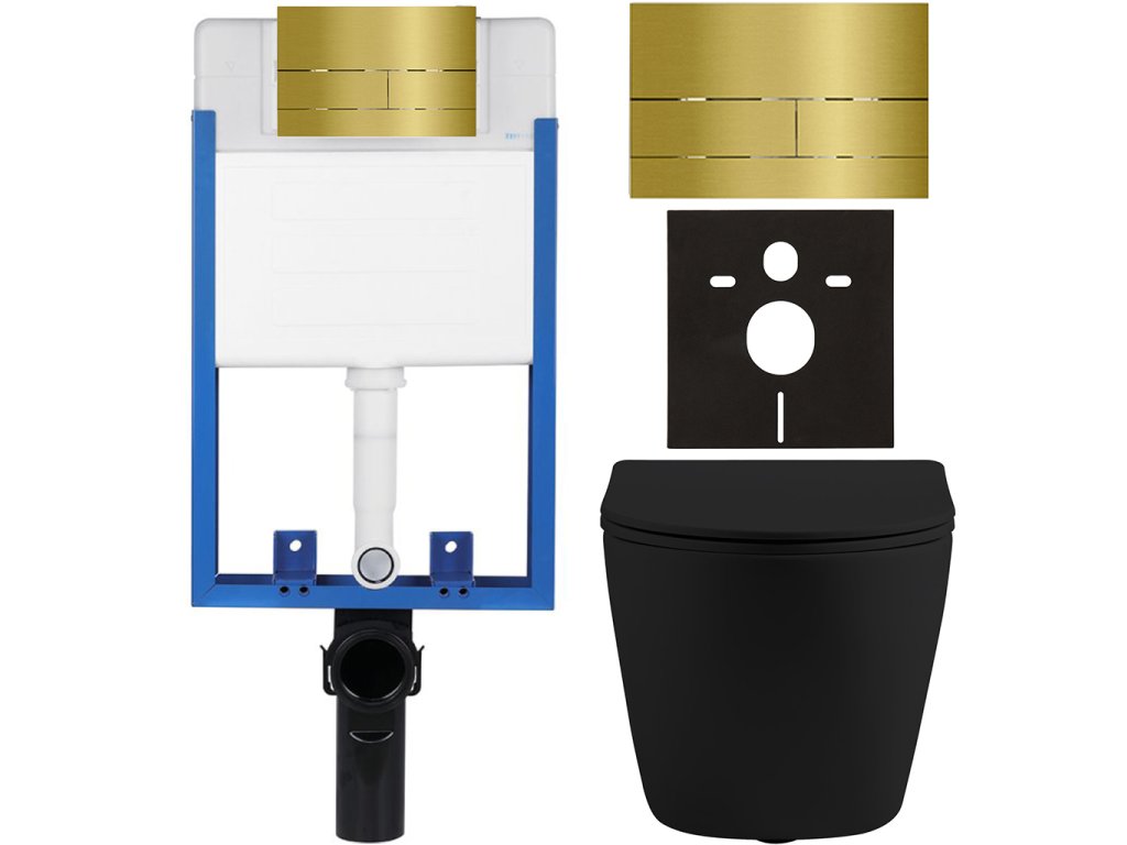 CERANO - Kompletný podomietkový WC set Lite/Cesso - čierna matná - WC tlačidlo Line. zlatá - na zamurovanie - 49x36 cm