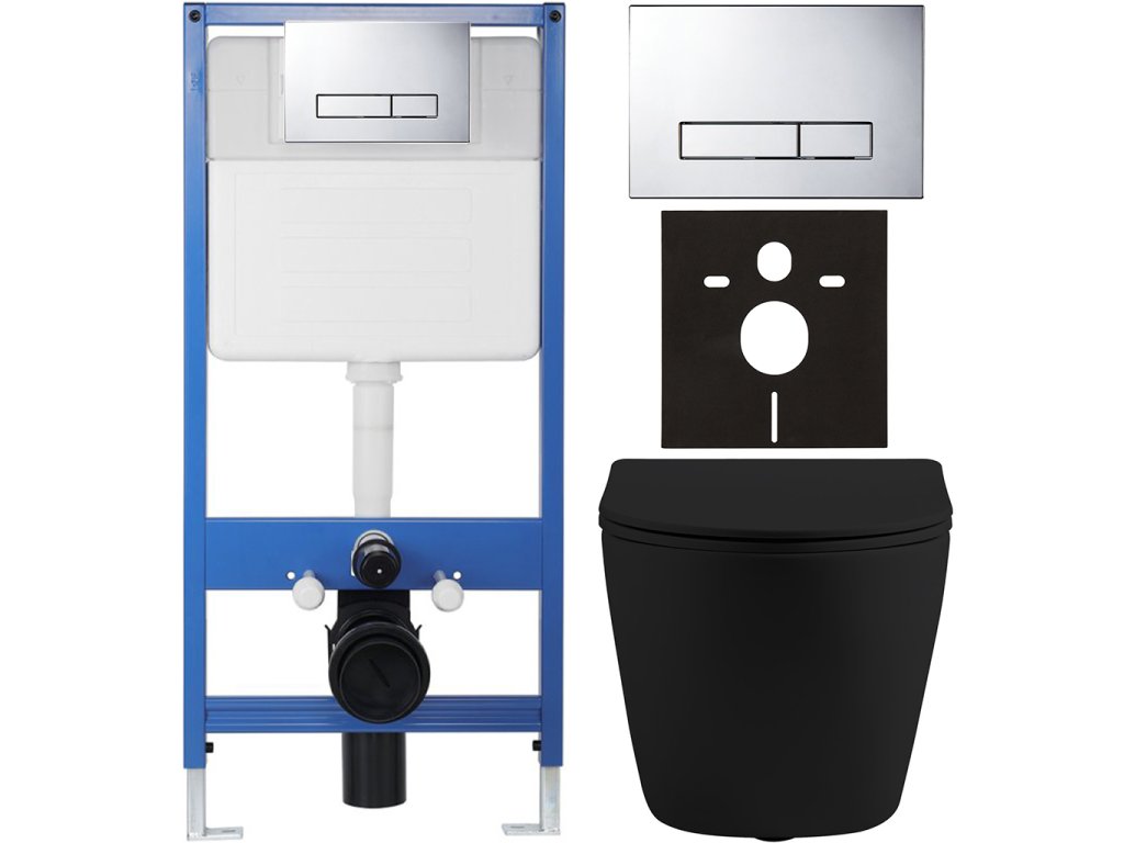 CERANO - Kompletný podomietkový WC set Lite/Cesso - čierna matná - WC tlačidlo Slim, chróm - predstenová inštalácia / sadrokartón - 49x36 cm