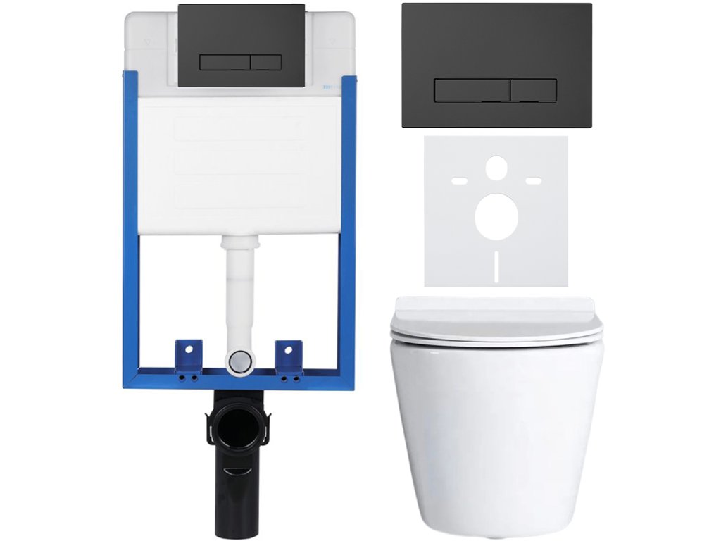 CERANO - Kompletný podomietkový WC set Lite/Norbi - biela lesklá - WC tlačidlo Slim, čierne matné - na zamurovanie - 48,5x36,5 cm