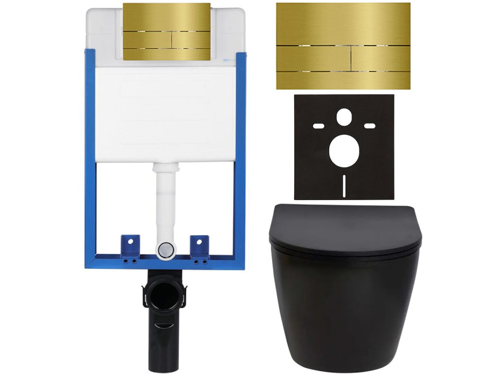 CERANO - Kompletný podomietkový WC set Lite/Verde - čierna matná - WC tlačidlo Line, zlatá - na zamurovanie - 49x36 cm