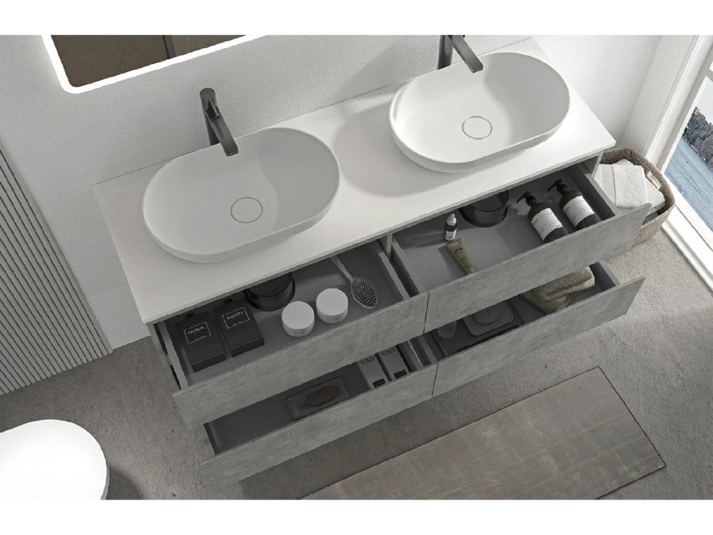 CERANO - Kúpeľňová skrinka Carole - betónovo šedá + doska pod umývadlo z lit. mramoru Elanys - 12 mm - biela matná - 140x49,2x46 cm