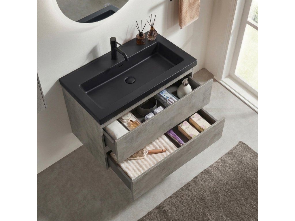CERANO - Kúpeľňová skrinka Carole - betónovo šedá + umývadlo z lit. mramoru Ovo - čierna matná - 60,5x53x46,3 cm