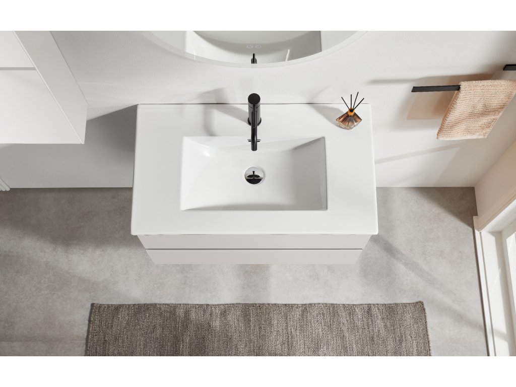 Kúpeľňové skrinky sú vyrobené z MDF lamina (stredne hustá drevovláknitá doska) s nalisovanou melamínovou fóliou, ktorá je odolná voči vlhkosti, poškriabaniu, UV žiareniu a bežným čistiacim prostriedkom. Povrch je hladký, tvrdý, homogénny a ľahko sa čistí. MDF dosky sa nekrútia ako masívne drevo. Pokiaľ dôjde k mechanickému narušeniu laminácie, samotné MDF jadro môže navlhnúť.