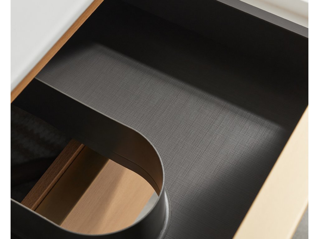 Zásuvka je osadená mechanizmom soft-close, ktorý kombinuje tlmiacu jednotku a pružinový systém pre riadené dovieranie. Pri zatváraní dochádza k automatickému spomaleniu pohybu a následnému tichému dotiahnutiu zásuvky do koncovej polohy. Mechanizmus zabraňuje nárazu, predlžuje životnosť zásuvky a zaisťuje vyšší užívateľský komfort.