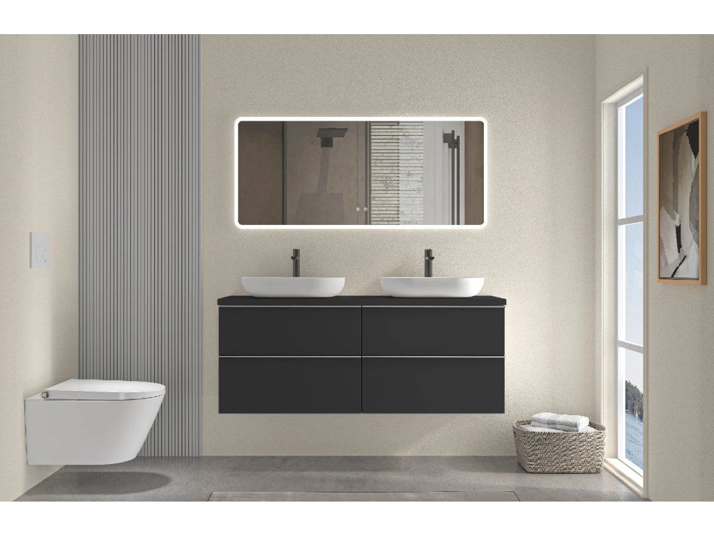 CERANO - Kúpeľňová skrinka Velora - čierna matná, úchytka chrómová + doska pod umývadlo Navira Pro - 36 mm - 160x56,6x46,5 cm