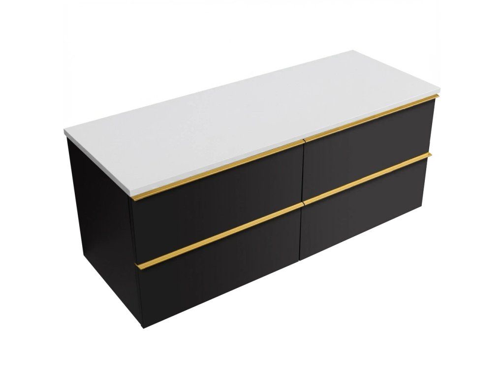 CERANO - Kúpeľňová skrinka Velora - čierna matná, úchytka zlatá + doska z lit. mramoru Elanys - 12 mm - biela matná - 140x54,2x46,5 cm