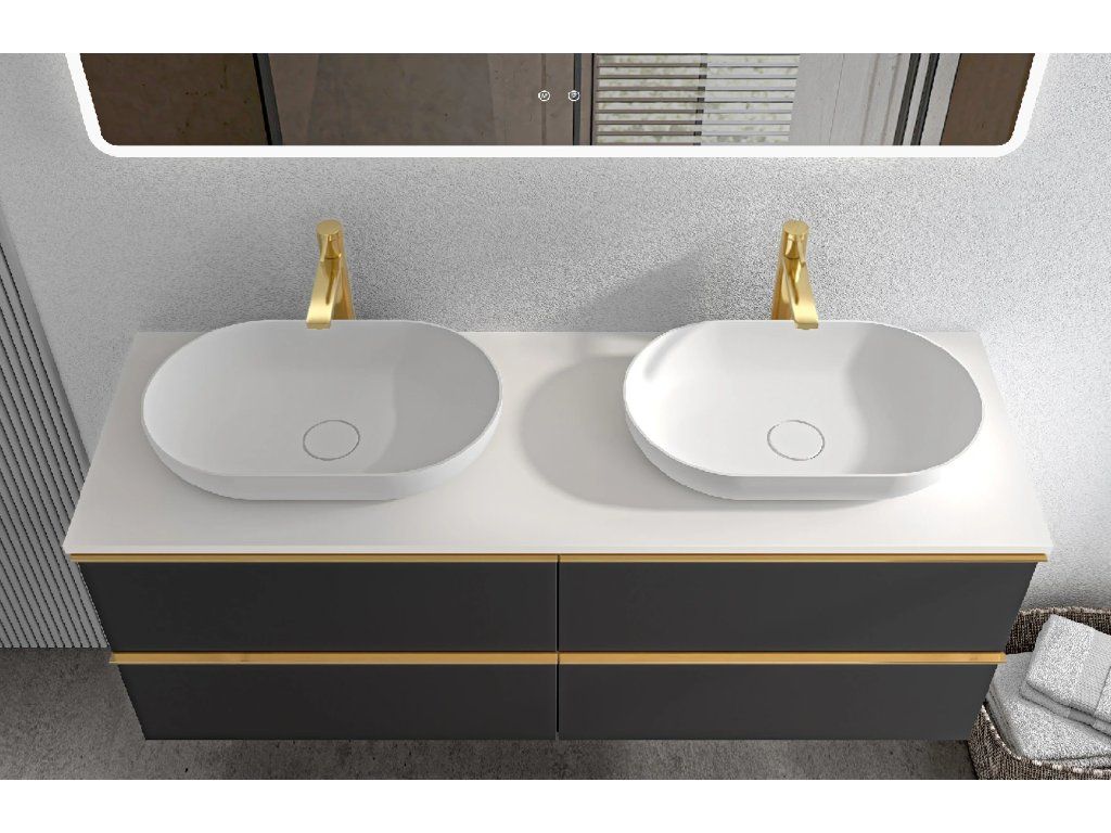CERANO - Kúpeľňová skrinka Velora - čierna matná, úchytka zlatá + doska z lit. mramoru Elanys - 12 mm - biela matná - 160x54,2x46,5 cm