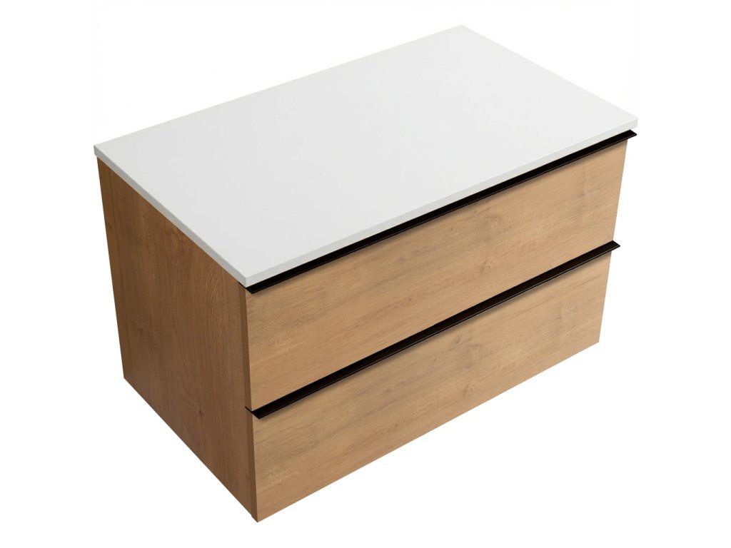 CERANO - Kúpeľňová skrinka Velora - dub medový, úchytka čierna + doska z lit. mramoru Elanys - 12 mm - biela matná - 100x54,2x46,5 cm
