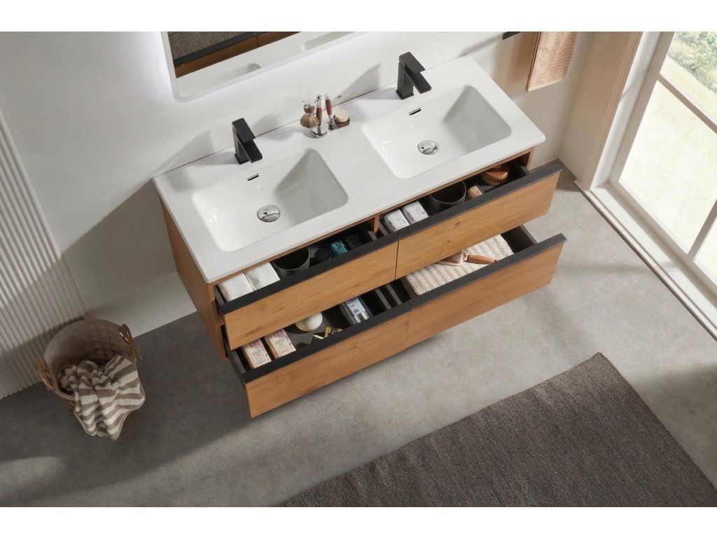 CERANO - Kúpeľňová skrinka Velora - dub medový, úchytka čierna + keramické umývadlo Novo - biela lesklá - 121x54,5x46,5 cm