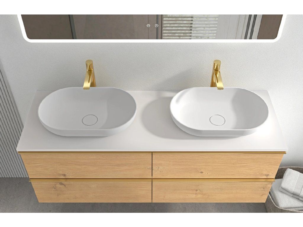 CERANO - Kúpeľňová skrinka Velora - dub medový, úchytka zlatá + doska z lit. mramoru Elanys - 12 mm - biela matná - 160x54,2x46,5 cm