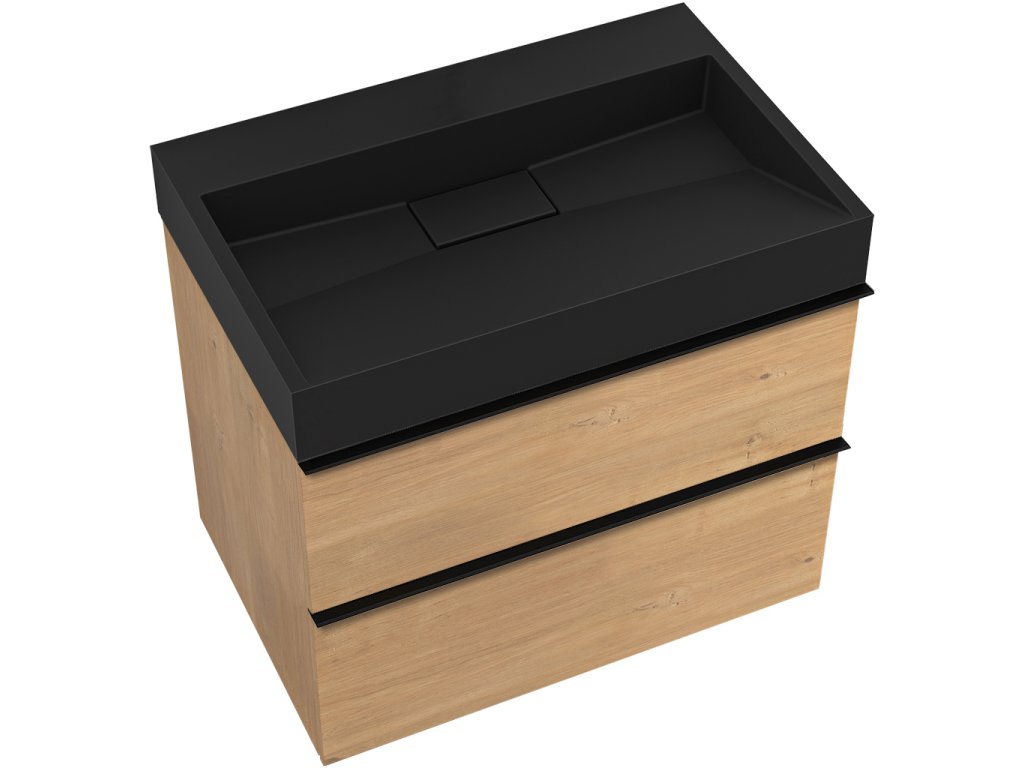 CERANO - Kúpeľňová skrinka Velora - dub medový - úchytka čierna + umývadlo z liateho mramoru Vita - čierna - 70x53x46 cm