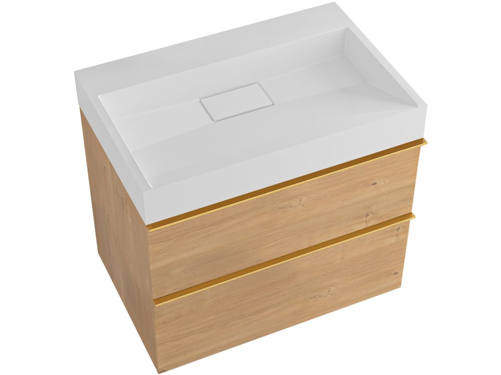 CERANO - Kúpeľňová skrinka Velora - dub medový - úchytka zlatá + umývadlo z liateho mramoru Vita - biela lesklá - 70x53x46 cm