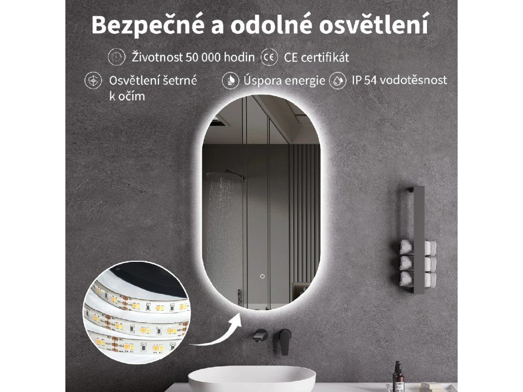 LED osvetlenie pri kúpeľňových zrkadlách prináša množstvo výhod: nižšie prevádzkové náklady, vyššia účinnosť a krytie IP, menšie tepelné vyžarovanie, dlhšia životnosť, možnosť stmievania, voľbu teploty chromatičnosti a rôzne varianty podsvietenia – po obvode, za zrkadlom alebo bodovo.