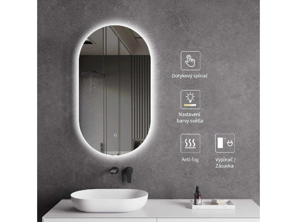 Zrkadlo je vybavené LED osvetlením s nastaviteľnou farbou svetla – od 3000 K (teplá) do 6000 K (Neutrálna). Prepínanie farieb jednoducho ovládate dotykovým tlačidlom na ploche zrkadla. Poskytuje intenzívne a jasné svetlo pre detailnú starostlivosť aj príjemné, jemné osvetlenie na relaxáciu. Vďaka širokému rozsahu teploty farieb tak ľahko prispôsobíte atmosféru aktuálnej potrebe.