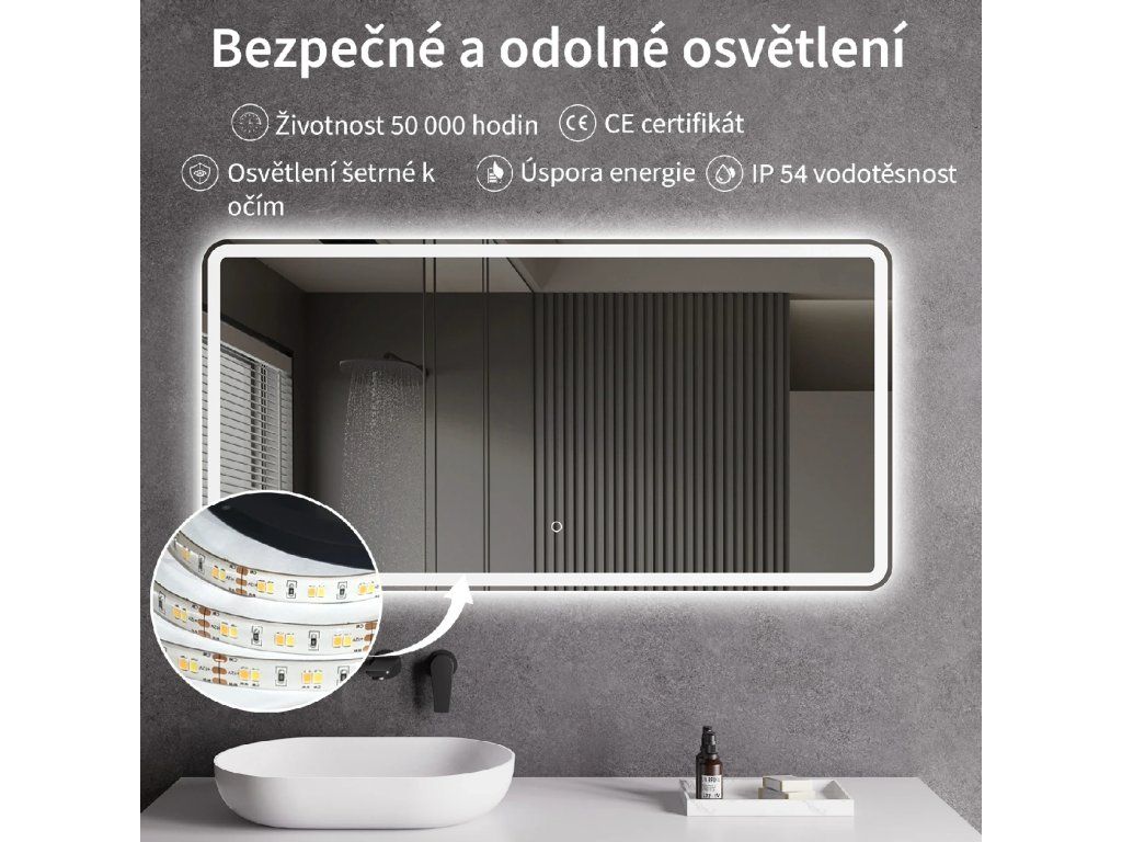 LED osvetlenie pri kúpeľňových zrkadlách prináša množstvo výhod: nižšie prevádzkové náklady, vyššia účinnosť a krytie IP, menšie tepelné vyžarovanie, dlhšia životnosť, možnosť stmievania, voľbu teploty chromatičnosti a rôzne varianty podsvietenia – po obvode, za zrkadlom alebo bodovo.