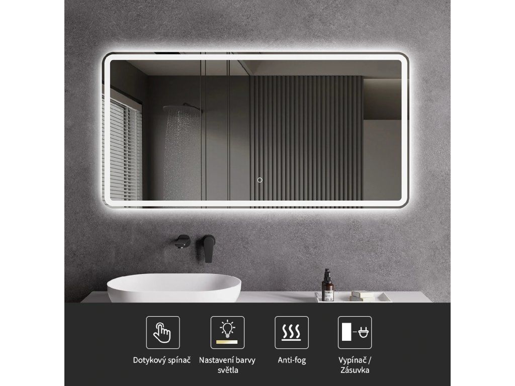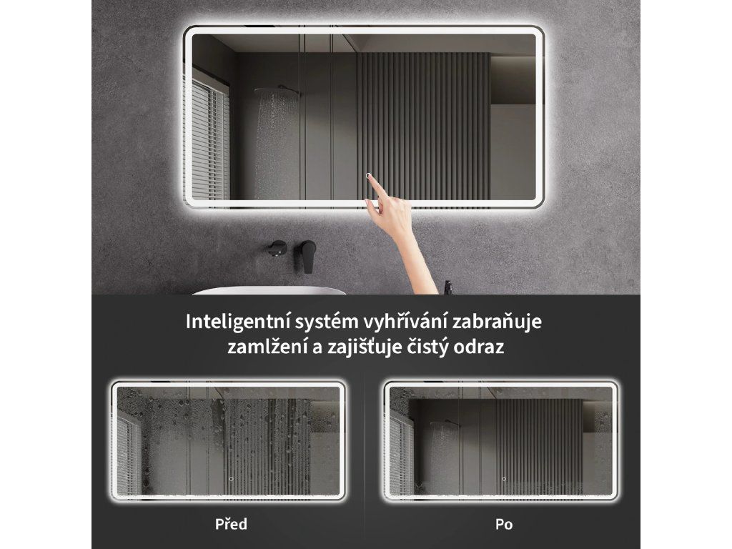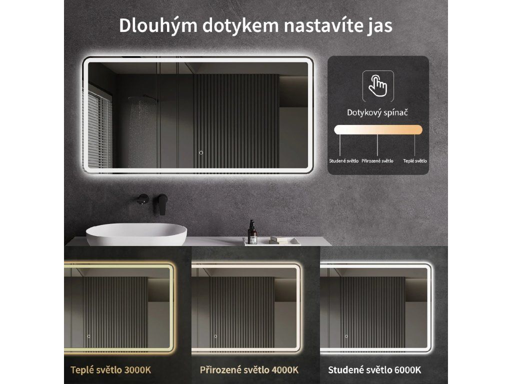Zrkadlo je vybavené LED osvetlením s nastaviteľnou farbou svetla – od 3000 K (teplá) do 6000 K (Neutrálna). Prepínanie farieb jednoducho ovládate dotykovým tlačidlom na ploche zrkadla. Poskytuje intenzívne a jasné svetlo pre detailnú starostlivosť aj príjemné, jemné osvetlenie na relaxáciu. Vďaka širokému rozsahu teploty farieb tak ľahko prispôsobíte atmosféru aktuálnej potrebe.