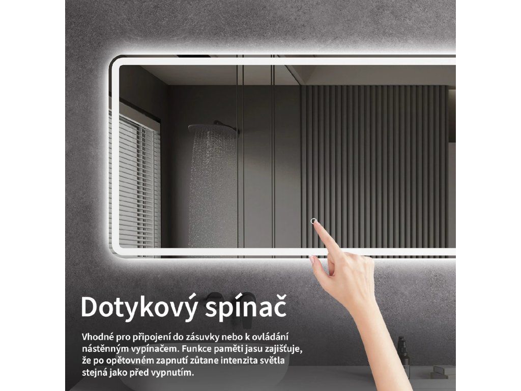 Osvetlenie zrkadla je možné ľahko a pohodlne zapnúť dotykom prepínača na paneli zrkadla. Umožňuje rýchle nastavenie osvetlenia bez nutnosti siahať po vzdialenejšom tradičnom vypínači.