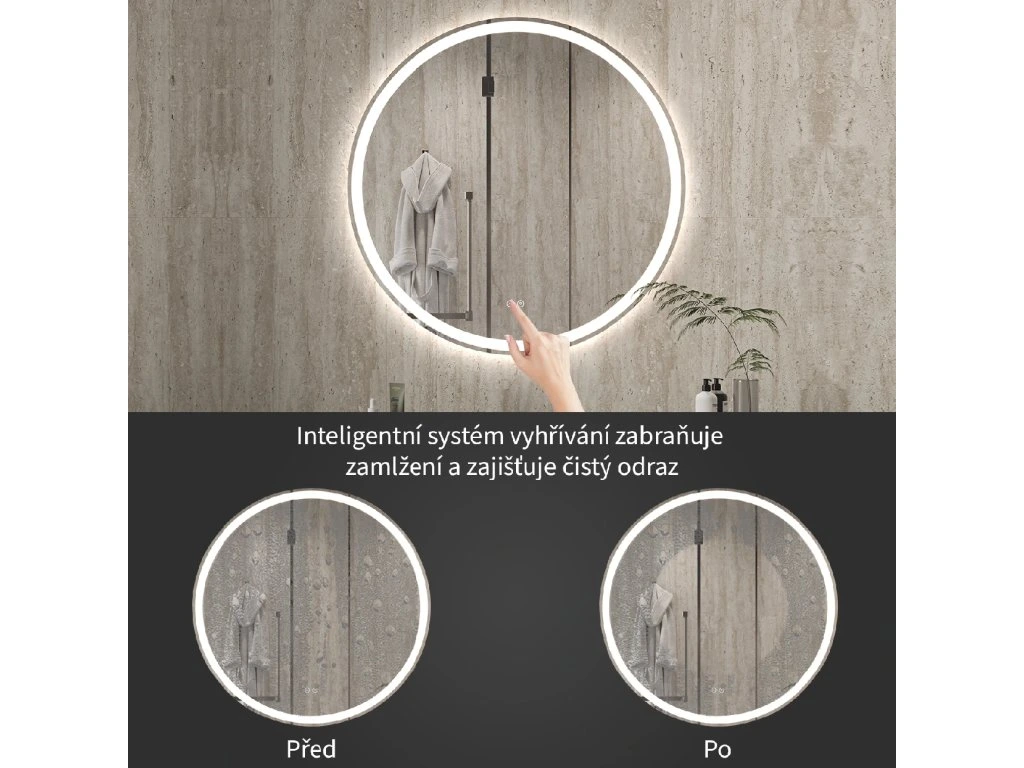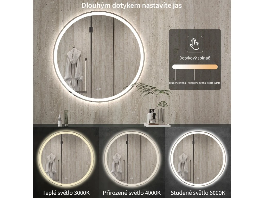 Zrkadlo je vybavené LED osvetlením s nastaviteľnou farbou svetla – od 3000 K (teplá) do 6000 K (Neutrálna). Prepínanie farieb jednoducho ovládate dotykovým tlačidlom na ploche zrkadla. Poskytuje intenzívne a jasné svetlo pre detailnú starostlivosť aj príjemné, jemné osvetlenie na relaxáciu. Vďaka širokému rozsahu teploty farieb tak ľahko prispôsobíte atmosféru aktuálnej potrebe.