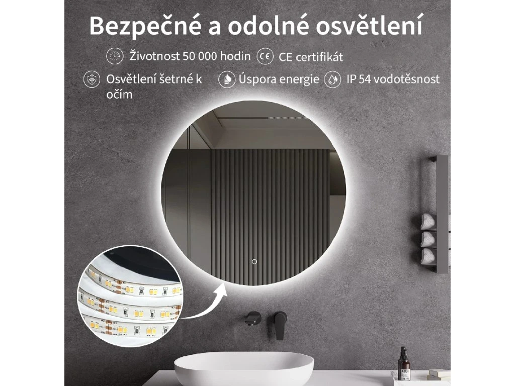 LED osvetlenie pri kúpeľňových zrkadlách prináša množstvo výhod: nižšie prevádzkové náklady, vyššia účinnosť a krytie IP, menšie tepelné vyžarovanie, dlhšia životnosť, možnosť stmievania, voľbu teploty chromatičnosti a rôzne varianty podsvietenia – po obvode, za zrkadlom alebo bodovo.