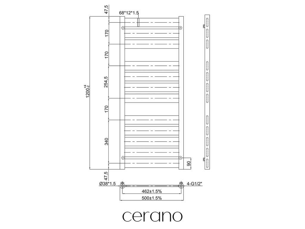 Štandardné pripojenie radiátora je 1/2", čo zaisťuje kompatibilitu s ventilmi a prípojnými sadami Cerano, aj od iných výrobcov. Uistite sa, že všetky súčasti zodpovedajú tomuto priemeru, aby bola zaistená bezpečná a efektívna prevádzka.