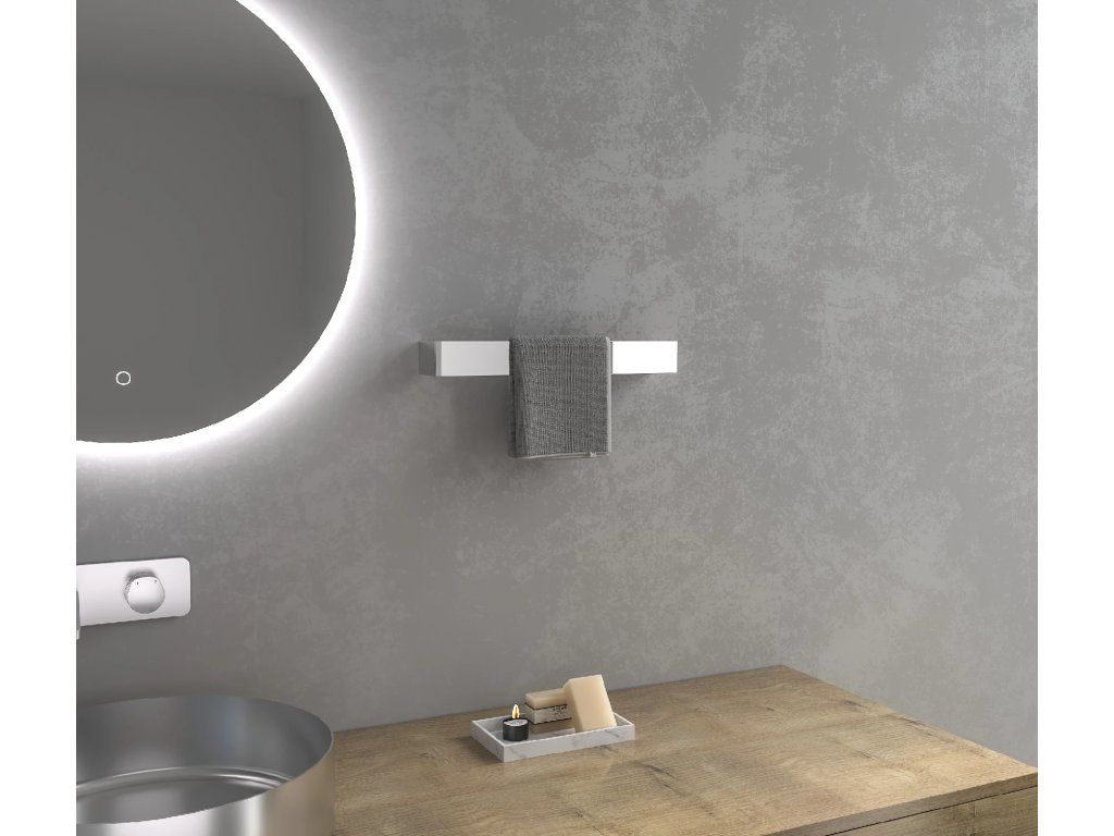 Predná strana s dlhým ramenom, ktoré slúži na umiestnenie uterákov. Toto rameno je pevne upevnené k stene pomocou dvoch malých montážnych skrutiek s hmoždinkami, ktoré sú diskrétne umiestnené na konci kratšieho ramena. Tento spôsob montáže zaisťuje vyššiu pevnosť a nosnosť celého držiaka. Montážna sada je súčasťou balenia.