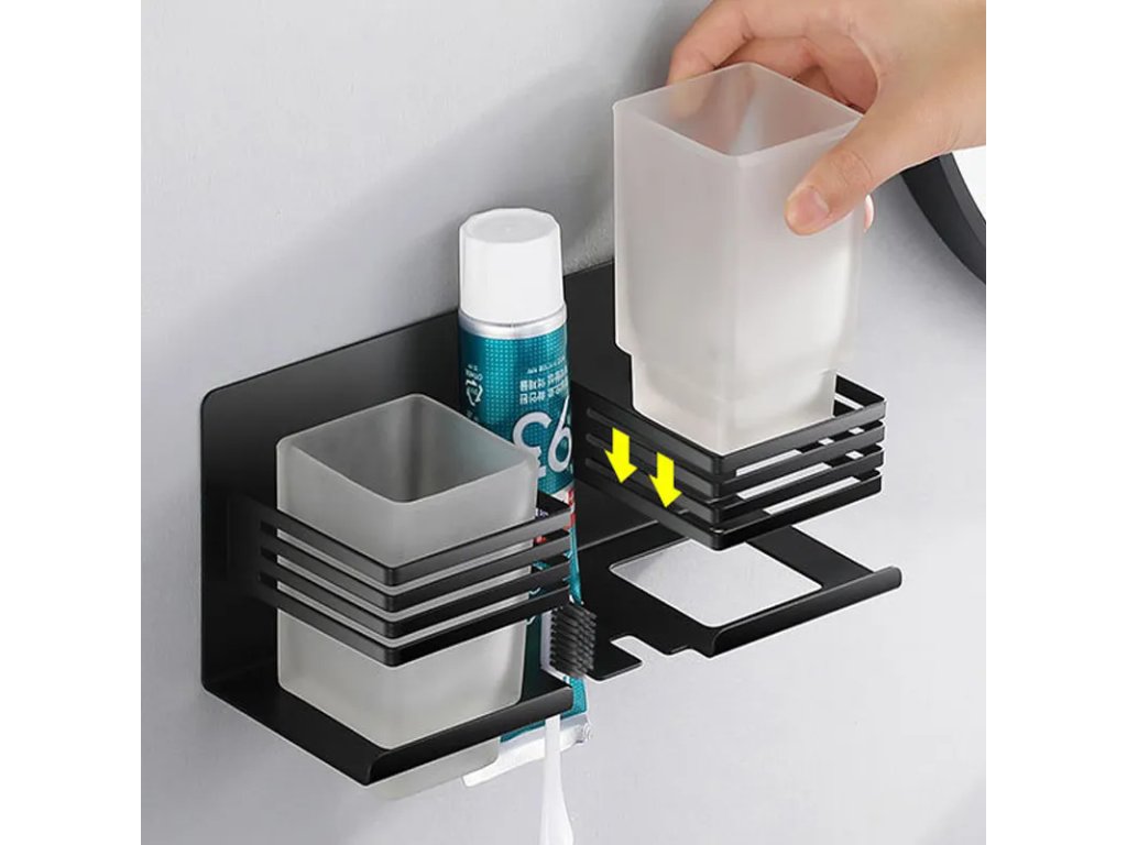 Samotný držiak poskytuje ideálne riešenie pre hygienické zavesenie zubných kefiek a vertikálne postavenie zubnej pasty vo výrezoch medzi pohármi.