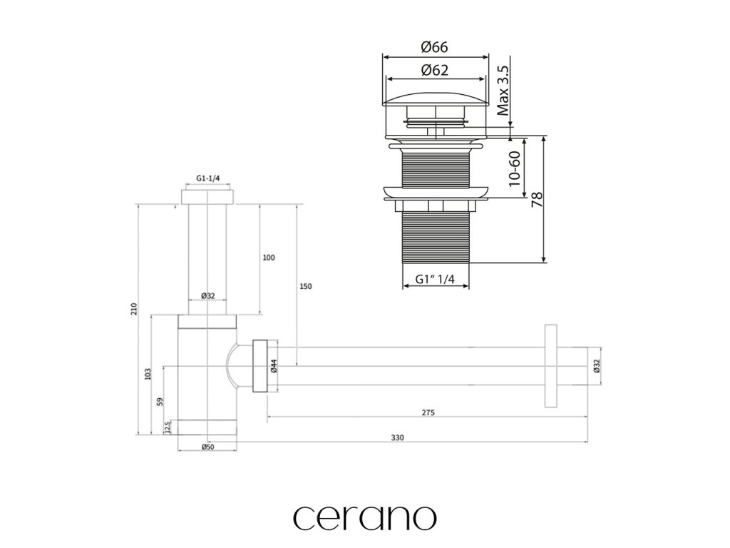 CERANO - Sifón umývadlový - mosadz - DN32 mm - s výpustom click-clack, bez prepadu - biela matná