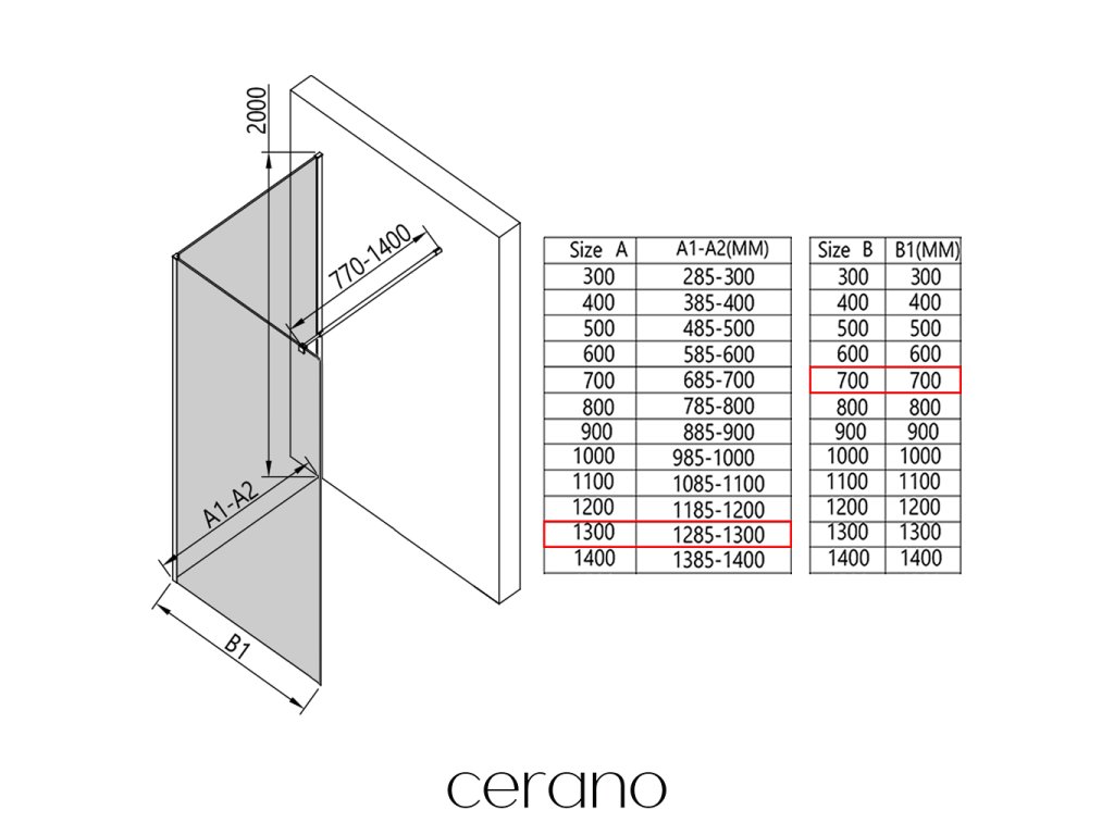 V rámci tejto série ponúkame širokú škálu rozmerov, aby sme uspokojili rôzne potreby našich zákazníkov. Všetky sprchové kúty, dvere a zásteny značky Cerano sú plne kompatibilné so sprchovými vaničkami Cerano v rovnakých rozmeroch, čo zaisťuje bezproblémovú inštaláciu a dokonalé zladenie. Sprchovací kút je možné navyše inštalovať flexibilne – buď na zodpovedajúcu sprchovú vaničku, alebo priamo na podlahu podľa vašich preferencií a možností kúpeľne.