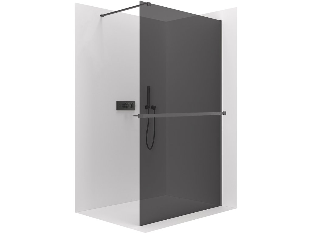 CERANO - Sprchová zástena Walk-in Onyx Cube Ľ/P - 8 mm + polička/držiak na uteráky - hranatá vzpera - čierna matná, grafitové sklo - 140x200 cm