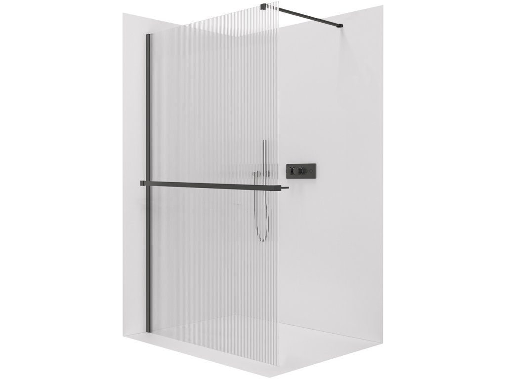CERANO - Sprchová zástena Walk-in Onyx Cube Ľ/P - 8 mm + polička/držiak na uteráky - hranatá vzpera - čierna matná, ryhované sklo - 140x200 cm