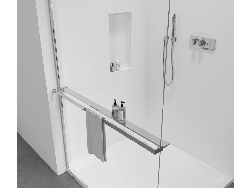 Inteligentné riešenie 2v1 pre sprchové zásteny. Z vonkajšej strany držiak na uteráky , zvnútra praktická polička na kozmetiku a drobnosti - všetko hneď po ruke. Vhodné pre sprchové zásteny s maximálnou hrúbkou skla 8 mm . Nastaviteľná šírka od 30 do 160 cm podľa typu zásteny. Úspora miesta, moderný vzhľad a praktické využitie v jednom.