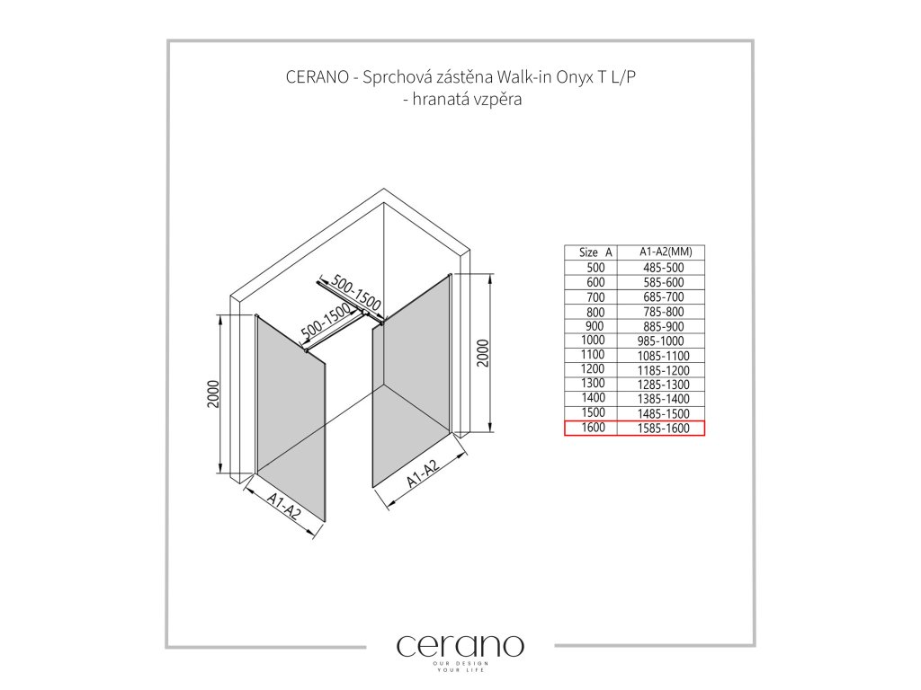 CERANO - Sprchová zástena Walk-in Onyx TL/P - 8 mm - hranatá vzpera - chróm, industriálne sklo - 160x130x200 cm