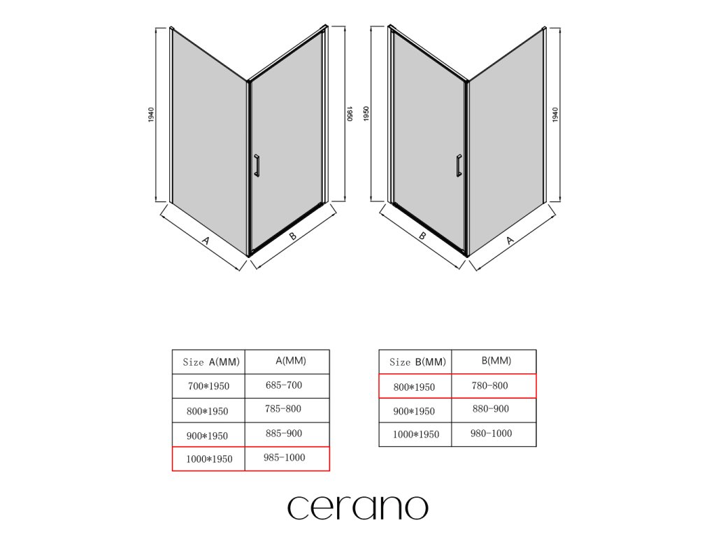 V rámci tejto série ponúkame širokú škálu rozmerov, aby sme uspokojili rôzne potreby našich zákazníkov. Všetky sprchové kúty, dvere a zásteny značky CERANO sú plne kompatibilné so sprchovými vaničkami CERANO v rovnakých rozmeroch, čo zaisťuje bezproblémovú inštaláciu a dokonalé zladenie. Sprchovací kút je možné navyše inštalovať flexibilne – buď na zodpovedajúcu sprchovú vaničku, alebo priamo na podlahu podľa vašich preferencií a možností kúpeľne.