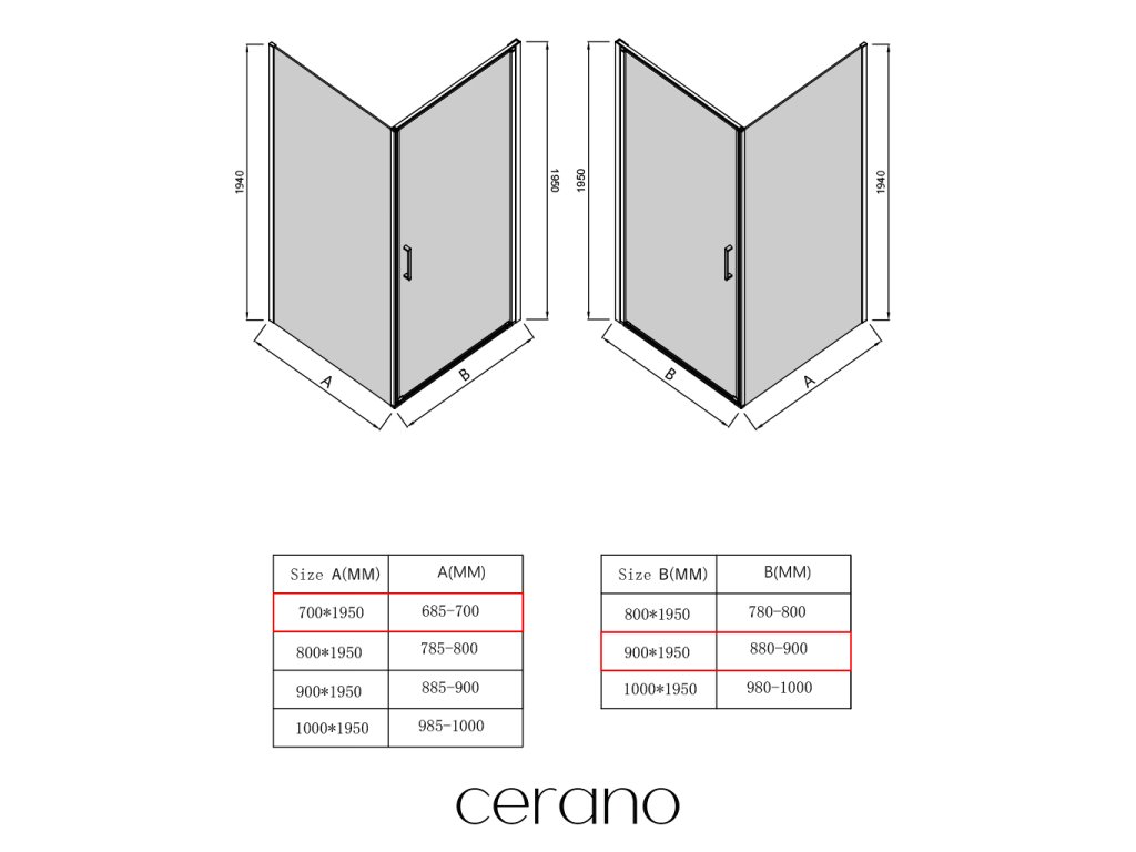 V rámci tejto série ponúkame širokú škálu rozmerov, aby sme uspokojili rôzne potreby našich zákazníkov. Všetky sprchové kúty, dvere a zásteny značky CERANO sú plne kompatibilné so sprchovými vaničkami CERANO v rovnakých rozmeroch, čo zaisťuje bezproblémovú inštaláciu a dokonalé zladenie. Sprchovací kút je možné navyše inštalovať flexibilne – buď na zodpovedajúcu sprchovú vaničku, alebo priamo na podlahu podľa vašich preferencií a možností kúpeľne.