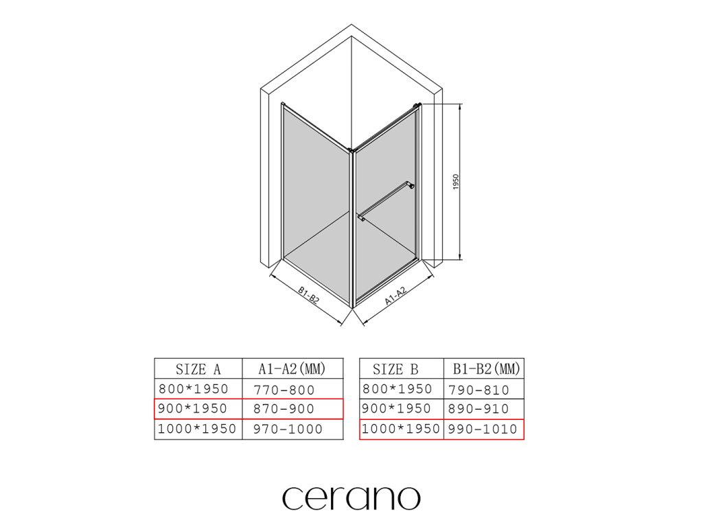 V rámci tejto série ponúkame širokú škálu rozmerov, aby sme uspokojili rôzne potreby našich zákazníkov. Všetky sprchové kúty, dvere a zásteny značky CERANO sú plne kompatibilné so sprchovými vaničkami CERANO v rovnakých rozmeroch, čo zaisťuje bezproblémovú inštaláciu a dokonalé zladenie. Sprchovací kút je možné navyše inštalovať flexibilne – buď na zodpovedajúcu sprchovú vaničku, alebo priamo na podlahu podľa vašich preferencií a možností kúpeľne.