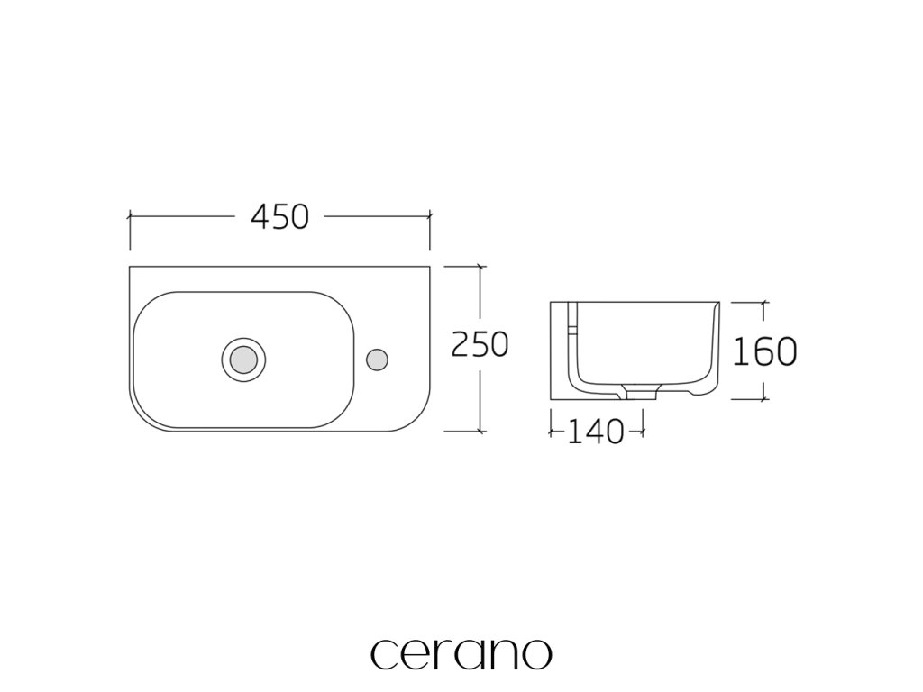CERANO - Umývadlo keramické - nástenné - Arco - pravá - biela lesklá - 45x25 cm