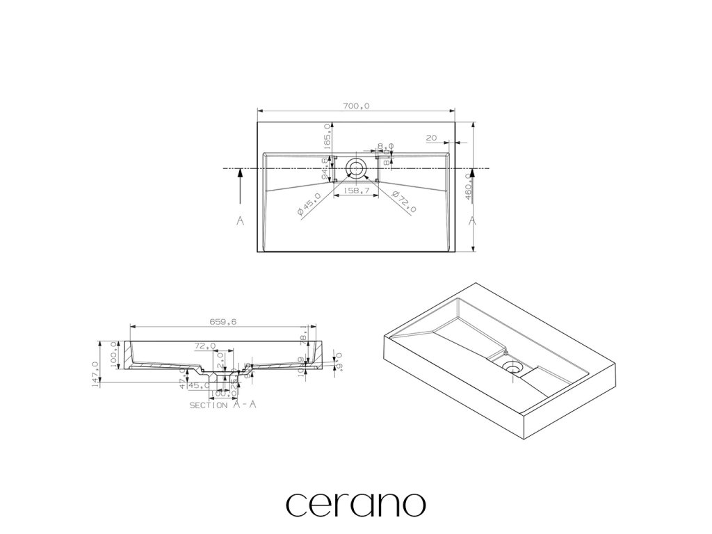 CERANO - Umývadlo z liateho mramoru Vita - nástenné aj na dosku - biela lesklá - 70x46 cm