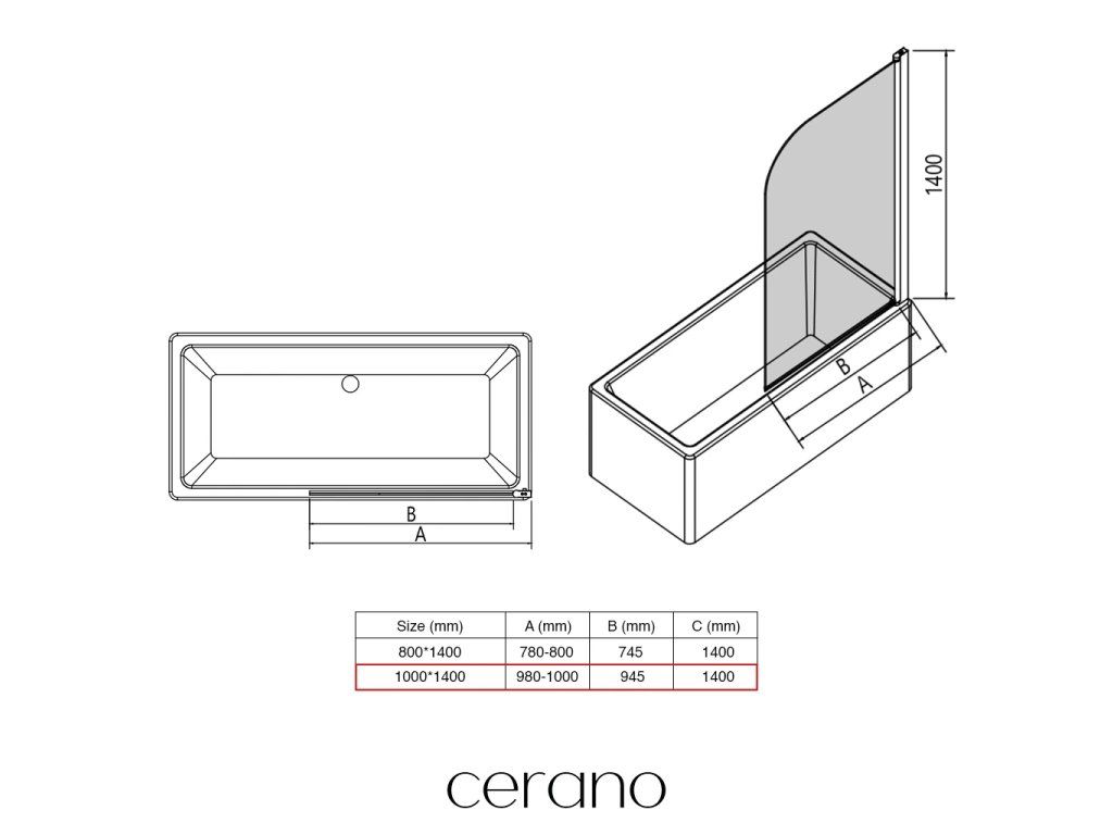 CERANO - Vaňová zástena jednodielna Chiara L/P - chróm/transparentné sklo - 100x140 cm