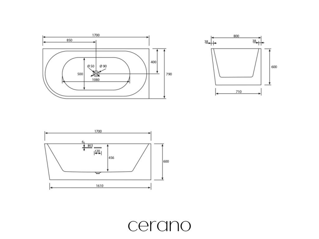 CERANO - Voľne stojaca akrylátová vaňa Bianco, pravá - čierna matná/biela lesklá - 170x79 cm