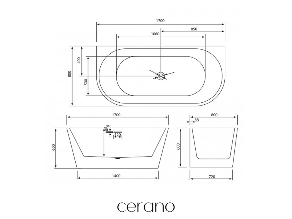 CERANO - Voľne stojaca akrylátová vaňa Grazia, nástenná - biela matná - 170x80 cm